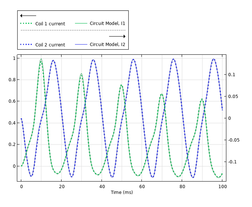 A 1D plot showing the voltage on the primary and current on the secondary compared between the full model and the electrical circuit model.