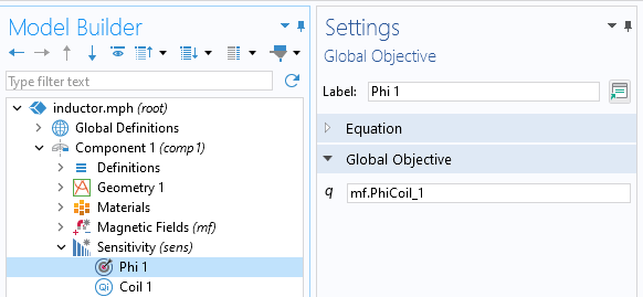 A close-up of the COMSOL Multiphysics UI showing the Model Builder with the Phi feature highlighted and the Settings window for the Global Objective with the Global Objective section expanded.